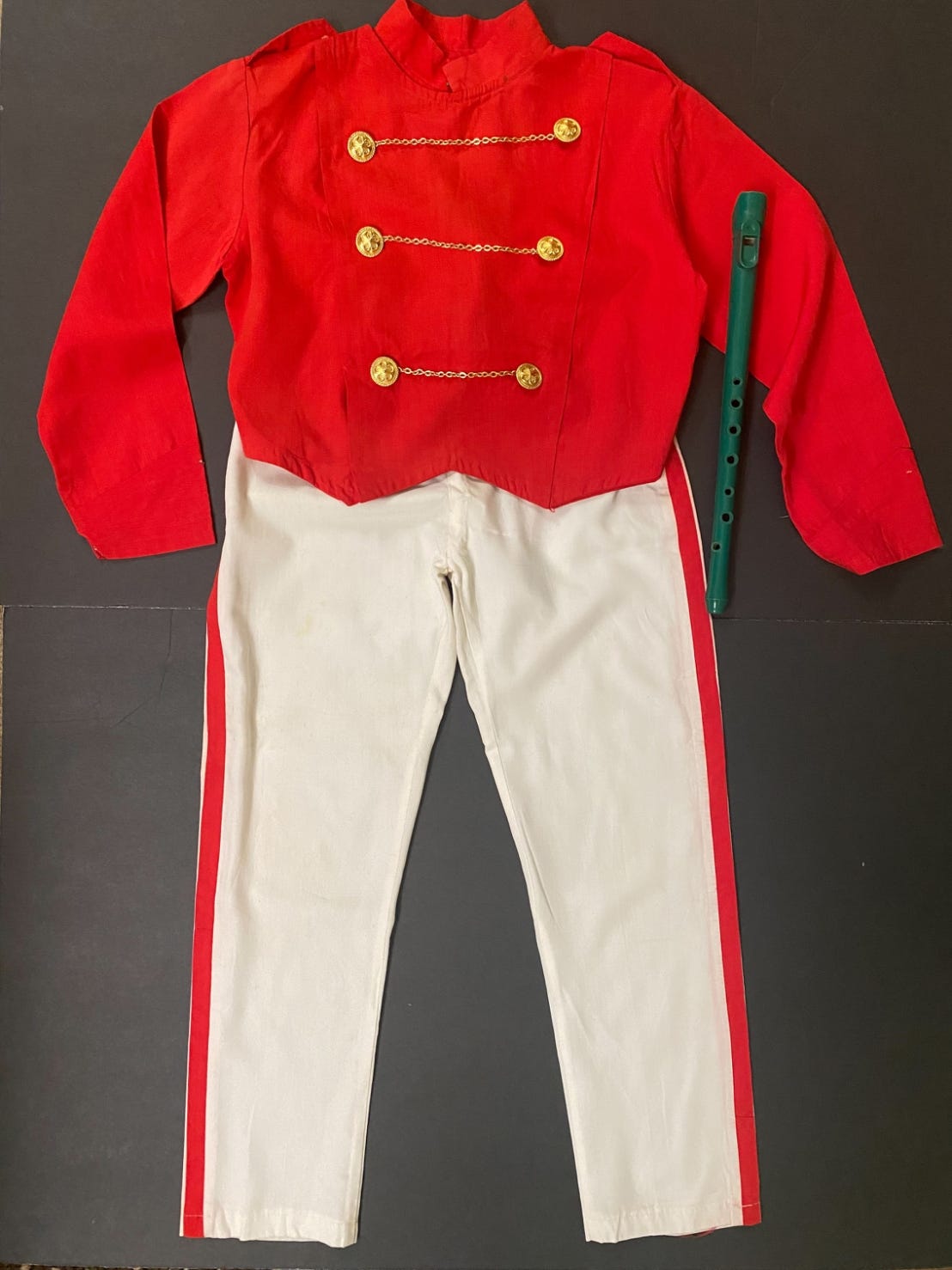 劉靜芝整燙乾淨的小學鼓笛隊制服【照片一】。照片裏,當年那支笛子也在😀。中間橫排的兩顆金扣金鍊掉了, 看哪位同學會用photoshop 修補。